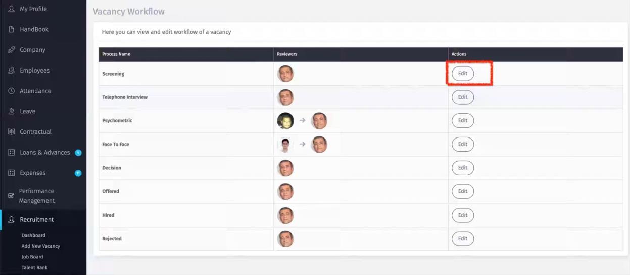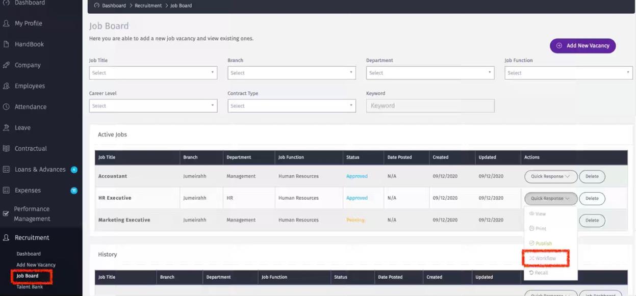 (iii) Recruitment process Workflow – Every job has a various stakeholder involved at every stage. To define the workflow for every job posting, go to Job Board and click on “Quick response” button and select “Workflow”. Then for every step of the process select the reviewer/approver based on the list of active employees.