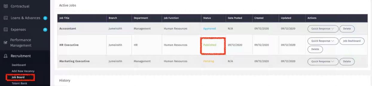 (iv) Publish – To post the job vacancy on the carry page or internally, go to Job Board and click on “Quick Response” button and select “Publish”. The job vacancy will appear on company career page and internally.