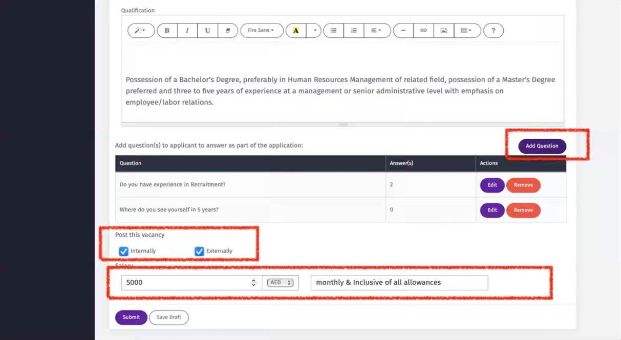 (e) The vacancy can be posted externally for external candidates through the career page or / and Internally for existing employees to view.