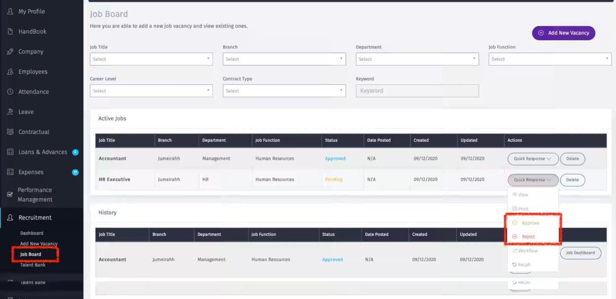 (ii) Approve Job Posting – Once the new vacancy is submitted, the job will appear in Job Board. The approver will click on “Quick Response” button to Approve/Reject.