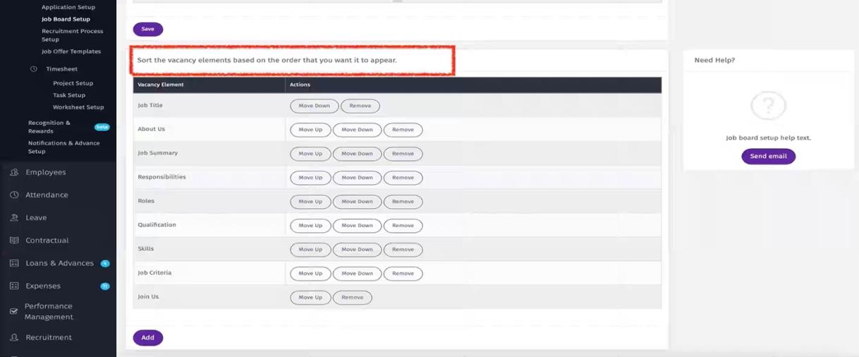 In this section you can edit/add and organize the order of appearance of the job elements.
