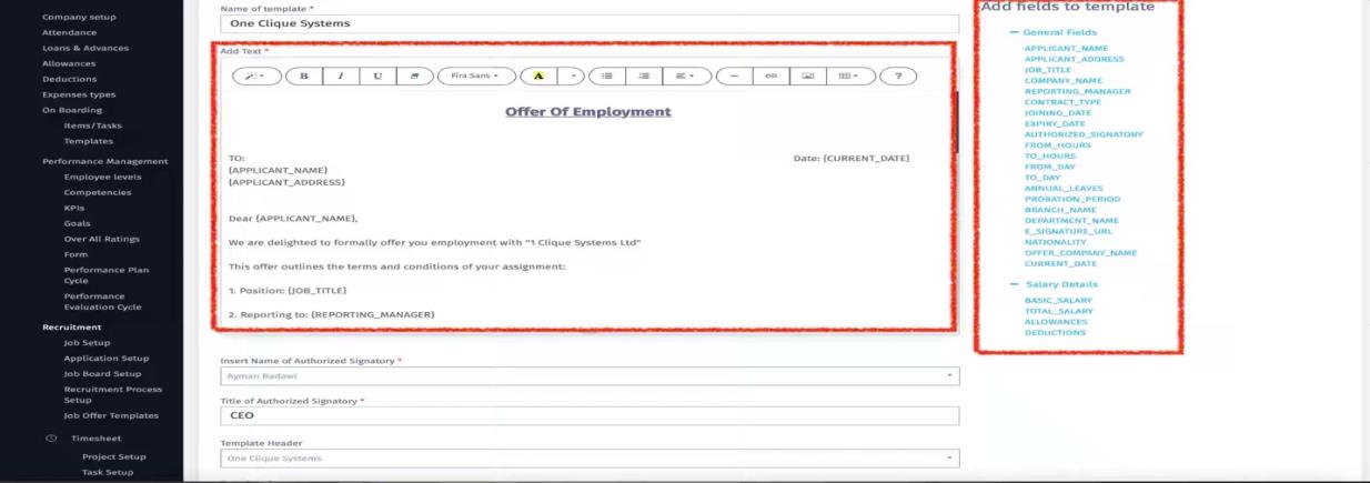 c. Add the content of the offer and select from the list in “Add fields to Template” all the details that should appear in the Job Offer section.