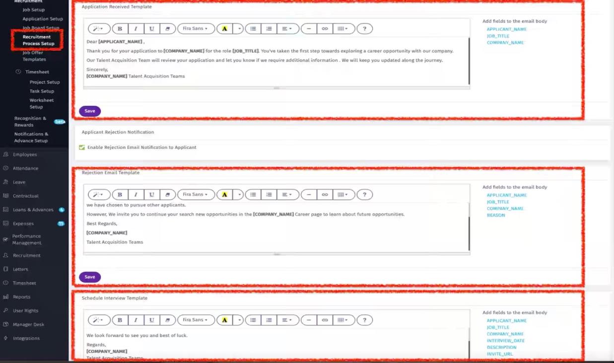 Define/edit email communication templates with candidates at various stages of the recruitment process.